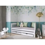 Transformeer de kinderslaapkamer met het moderne bed met laden van hout genaamd Lotus. Het bevat 2 onderste laden voor handige opslag en een extra bed, geschikt om de ruimte te maximaliseren of voor speciale gelegenheden waarbij je je beste vrienden uitnodigt om te blijven slapen. De inbegrepen leuning, die je naar wens kunt plaatsen of verwijderen afhankelijk van de leeftijd, zorgt voor veiligheid zonder stijl te verwaarlozen.