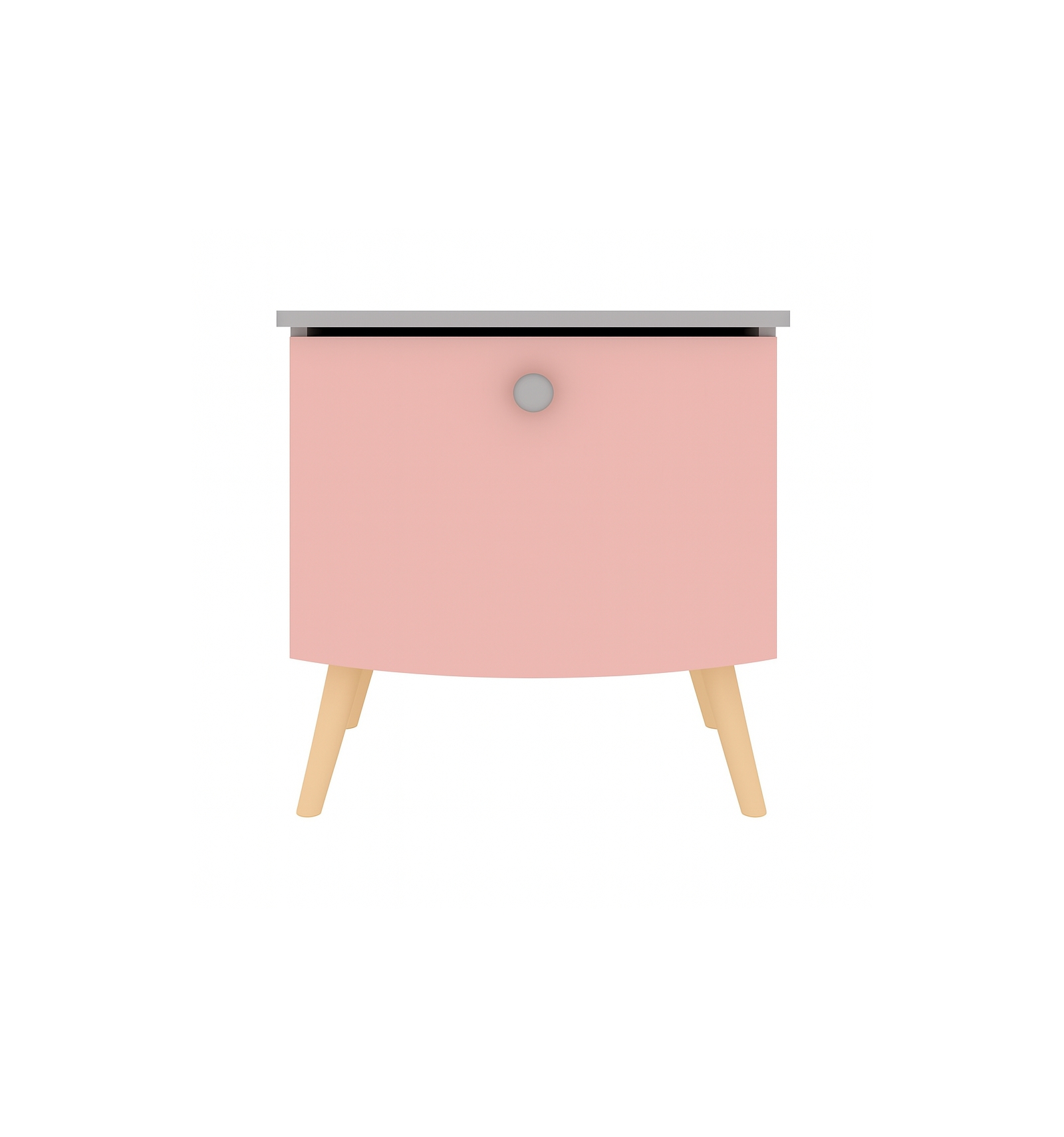 Het kinder-nachtkastje Ringo is een functioneel en elegant meubelstuk voor de kinderkamer. Gemaakt van hoogwaardig MDF, combineert het duurzaamheid en design in zachte tinten wit, roze en grijs. De lade met telescoopgeleiders biedt praktische opbergruimte voor persoonlijke spullen, terwijl de retro-stijl schuine poten extra stabiliteit en een moderne, tijdloze uitstraling geven.