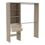 - Ophangrail: Het heeft 2 ophangrails van 119,2 cm die tot 48 kg kunnen dragen. Dankzij zijn veelzijdigheid past deze open kledingkast met 2 lades zich aan kleine ruimtes aan, aangezien hij een diepte van 44 cm heeft en de lengte gemakkelijk verstelbaar is door de ophangrails in te korten. De kolom met lades kan naar wens rechts of links worden geplaatst.