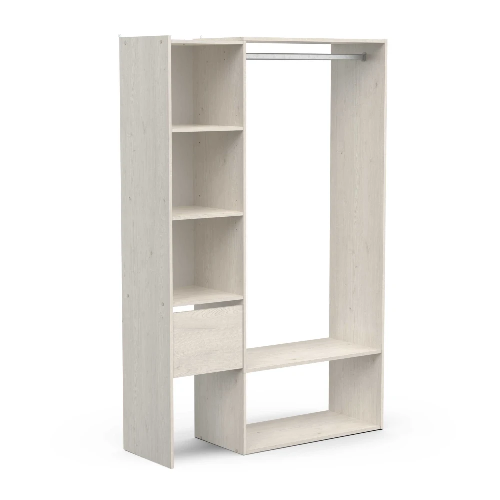 Deze kledingkast omvat verschillende planken voor truien en andere accessoires, een lade en een praktische hanger met ruime capaciteit. De onderste plank is zeer geschikt voor schoenen of opbergdozen. Bovendien maakt de hoogte van 183 cm het mogelijk om de bovenkant als extra opbergruimte te gebruiken.